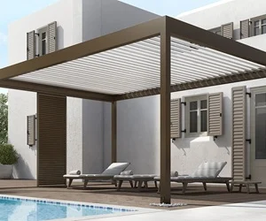 Σύστημα πέργκολας με περιστρεφόμενες περσίδες για ρυθμιζόμενη σκίαση και προστασία από τη βροχή. Ιδανική για τη μετατροπή ενός ανοιχτού χώρου σε ένα άνετο και ευχάριστο περιβάλλον.